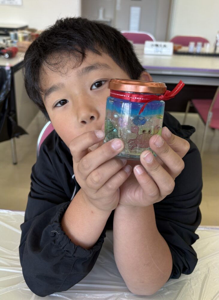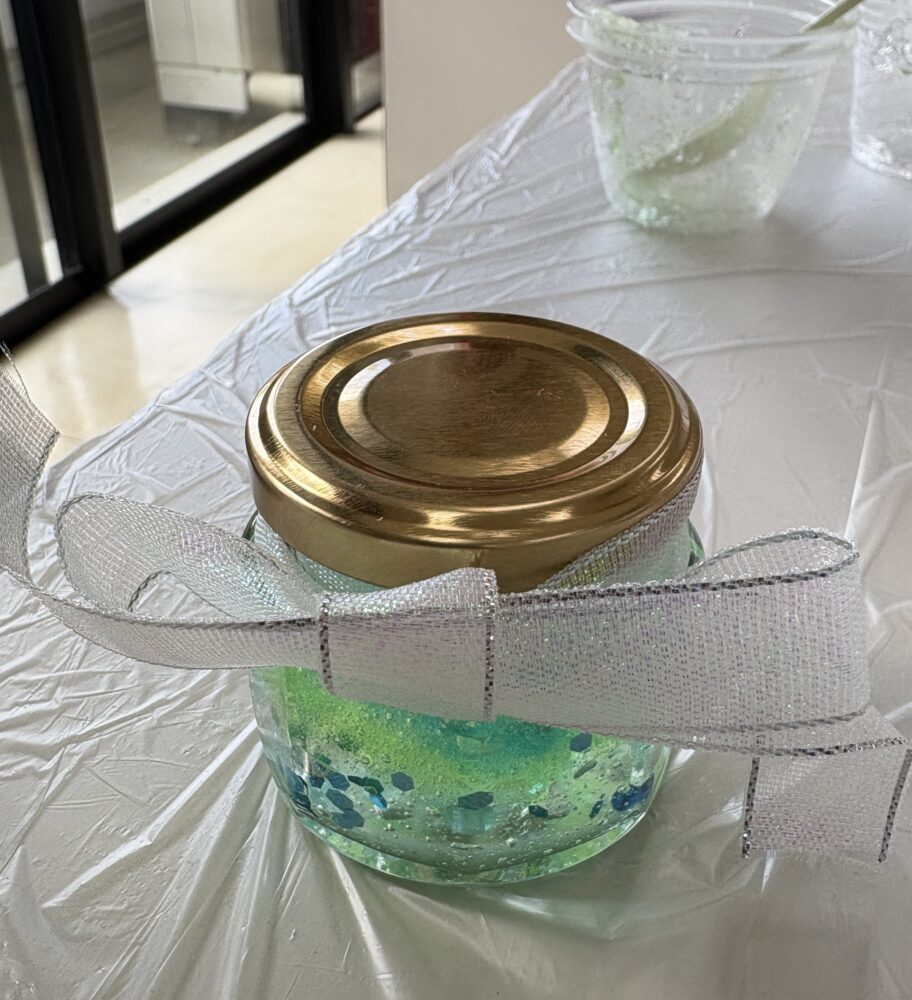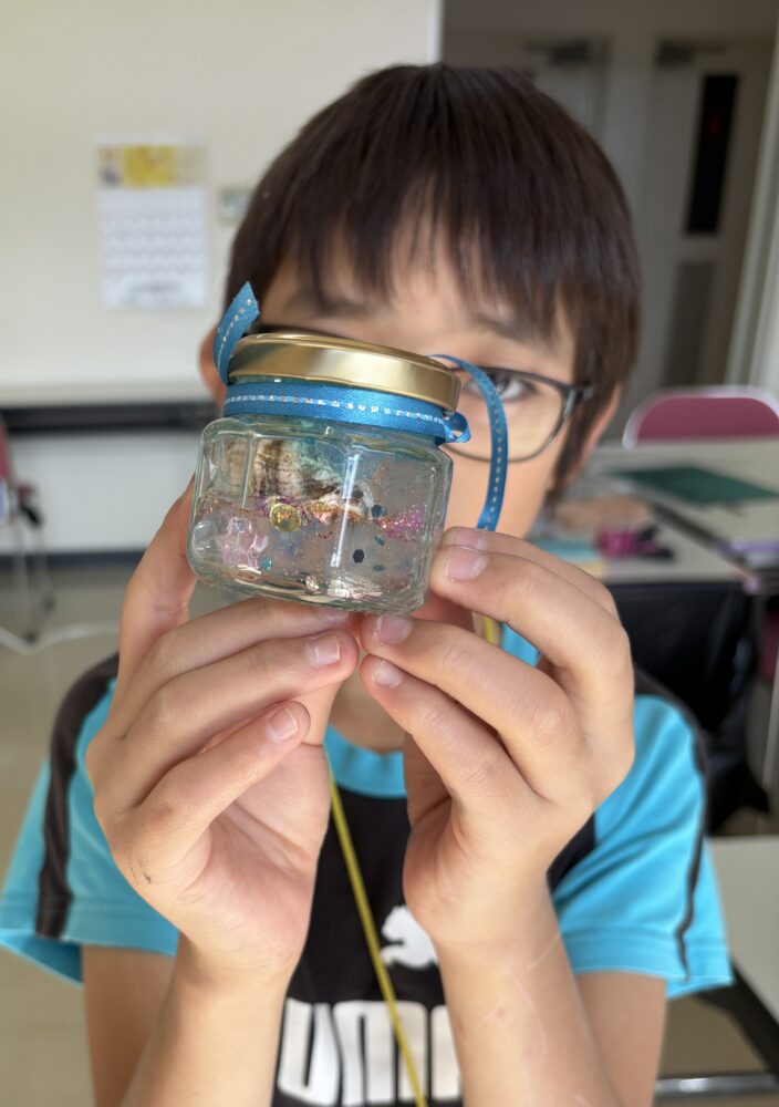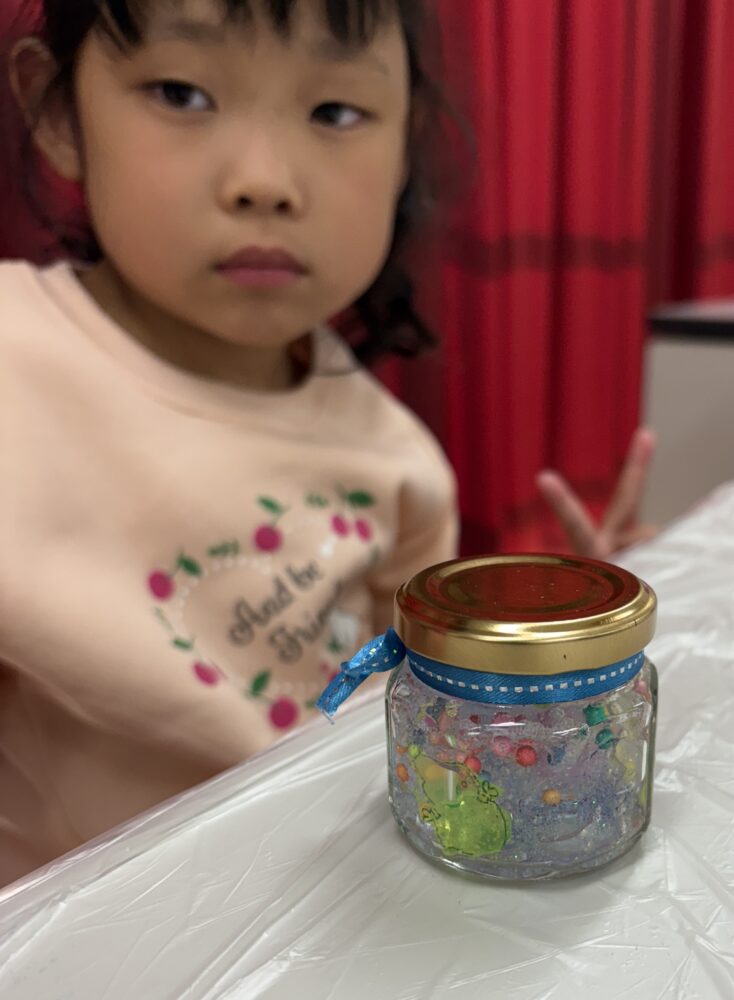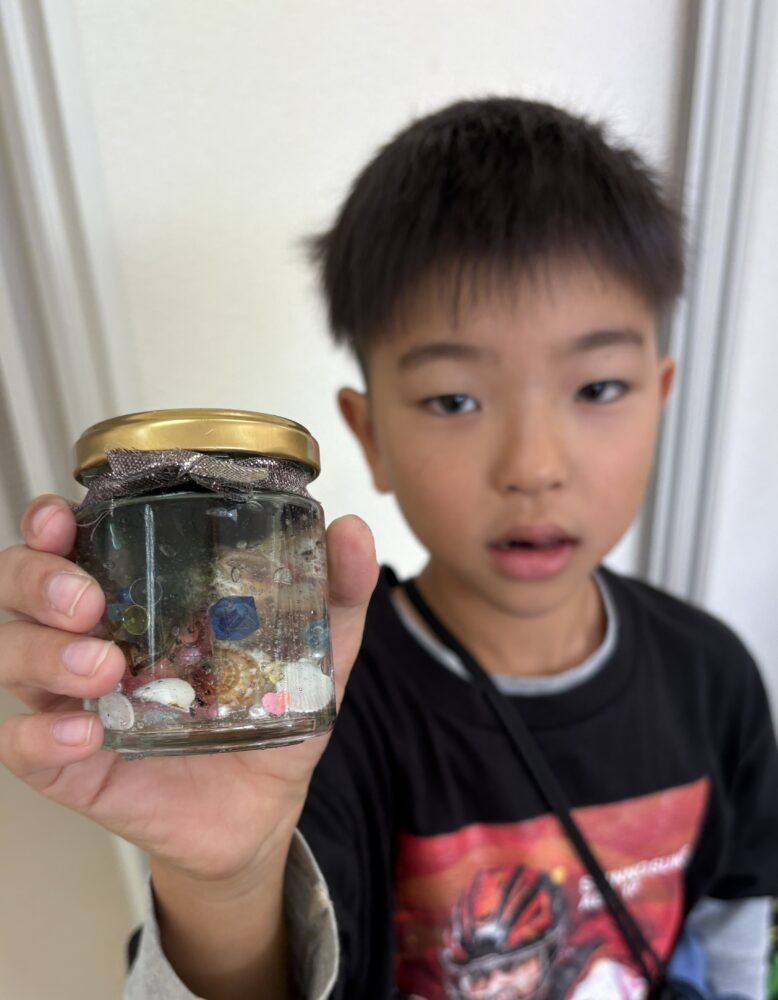 保冷剤の中身の吸水ポリマーを水と混ぜ合わせて、色をつけたり、ラメを入れたりしたあと、好きな形に切り抜いたカラフルなビニールシートや貝殻と一緒に、小さな瓶に詰めて完成。