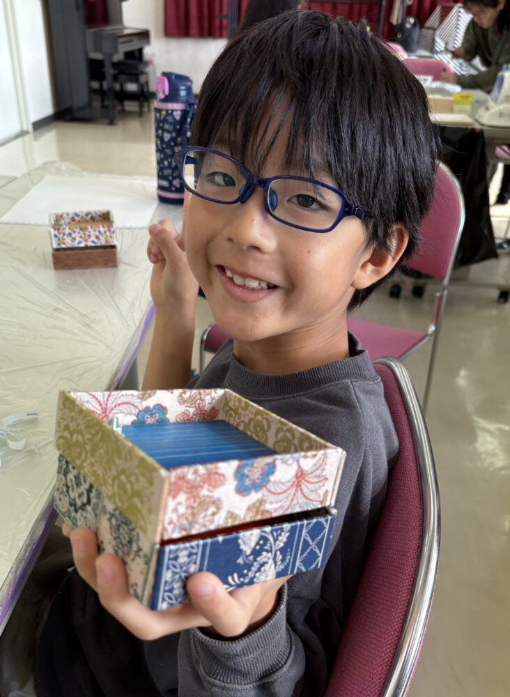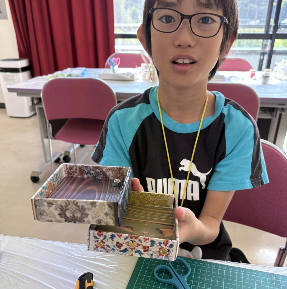 今回は、側面板にマスキングテープを貼って模様をつけるか、塗装してシンプルに仕上げるかを選んでもらいましたよ。箱型への組み立てには、激強力両面テープを使うので、比較的短時間で素敵な2段ボックスが完成します。