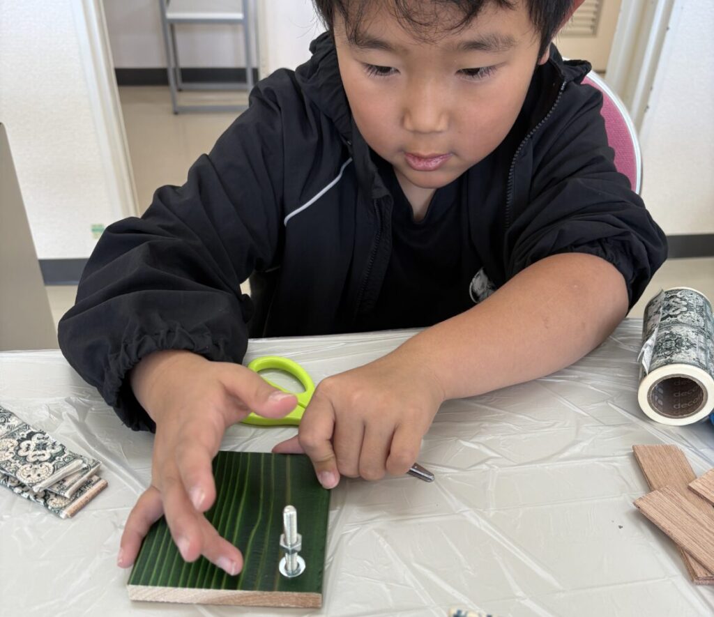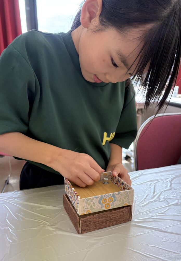 ボルト、ナット、ワッシャーを使って箱同士を上段下段に連結させていく工程は、見本を見て、「こういう仕組みなのか~」と理解しながら取り組んでくれる子もいました。「ナット」は「なっとう」が覚えやすい!と普段使わない道具にも親しみをもちながら触れてくれました。