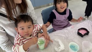 けいそう土の粉と水と絵の具を混ぜるときには、おうちの人と一緒におままごとのように楽しんでくれていました♪